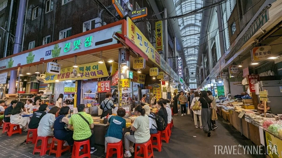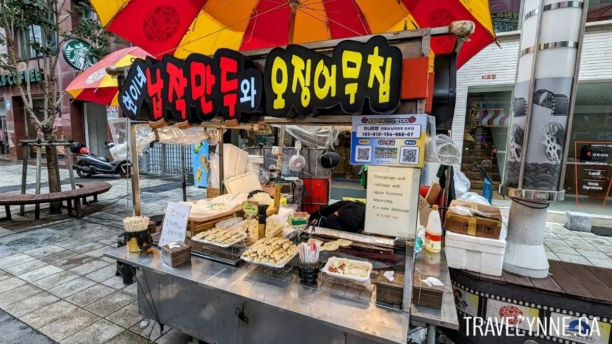On a normal day, it's a regular square and pedestrian street, but with loads of delicious street food options for you to indulge in, like hotteok (sweet pancakes) stuffed with seeds and honey, gyeran-ppang (sizzling egg bread), tteokbokki (spicy rice cakes), eomuk (fish cakes), mandu (Korean dumplings), pajeon (savoury pancakes). You will find street food like this here or at Gukje Market, your next stop, so be sure to save space to enjoy!