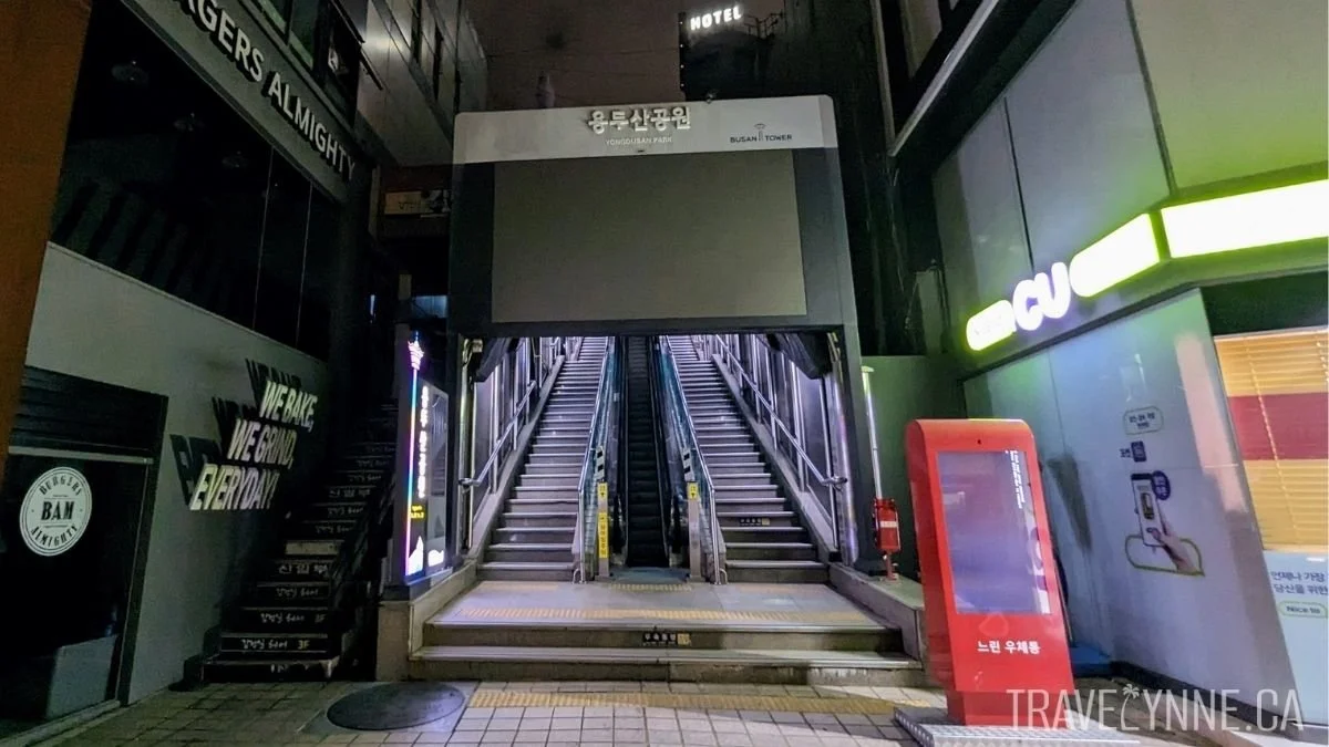 One of the entrances to Yongdusan Park is via these unassuming escalators - but don’t be deceived, they lead to a cool light art exhibit and eventually to the park with the Busan Tower